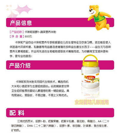 卡咪呢有機(jī)米粉系列是專為中國寶寶設(shè)計(jì)的營養(yǎng)輔食,選用有機(jī)大米,科學(xué)搭配維生素AD等維生素,還特別添加牛磺酸、DHA、AA等有助智力發(fā)育的營養(yǎng)成分,富含15種營養(yǎng)素,F(xiàn)上海卡咪呢母嬰用品有限公司面向全國空白市場區(qū)域誠招卡咪呢有機(jī)米粉代理商。