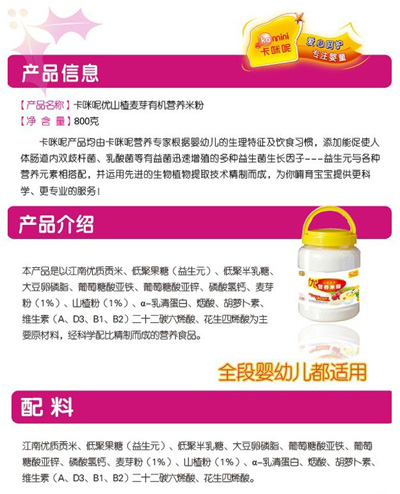卡咪呢有機(jī)米粉系列是專為中國(guó)寶寶設(shè)計(jì)的營(yíng)養(yǎng)輔食,選用有機(jī)大米,科學(xué)搭配維生素AD等維生素,還特別添加;撬、DHA、AA等有助智力發(fā)育的營(yíng)養(yǎng)成分,富含15種營(yíng)養(yǎng)素。現(xiàn)上?ㄟ淠啬笅胗闷酚邢薰久嫦蛉珖(guó)空白市場(chǎng)區(qū)域誠(chéng)招卡咪呢有機(jī)米粉代理商。