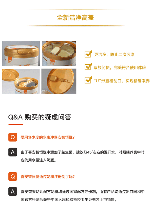 營養(yǎng)夠,易吸收才是好奶粉。喜安智較大嬰兒配方奶粉,消化吸收新升級。100%原裝進口,采用全新的MFS脂肪升級技術(shù),讓寶寶對脂肪的消化吸收更加nearto母乳,提高對于奶粉當(dāng)中脂肪和鈣的吸收。