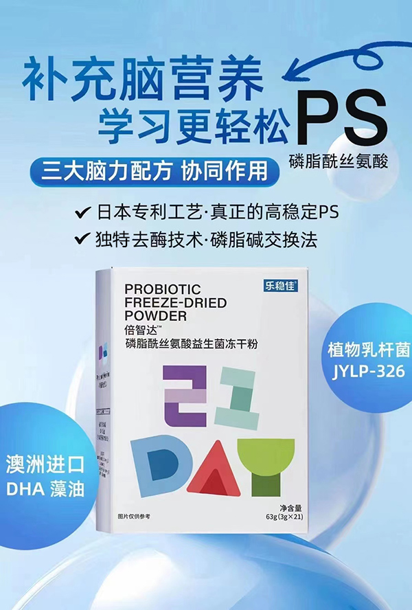 樂穩(wěn)佳倍智達(dá)磷脂酰絲氨酸益生菌凍干粉,澳洲進(jìn)口DHA藻油,植物乳桿菌JYLP-326,日本專利工藝·真正的高穩(wěn)定PS,獨特去酶技術(shù)·磷脂堿交換法,三大腦力配方,協(xié)同作用,補(bǔ)充腦營養(yǎng),學(xué)習(xí)更輕松。