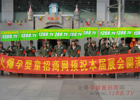 我們火爆孕嬰童穿上我們標志性服裝,身穿紅衛(wèi)兵綠色軍裝,頭戴火爆字樣綠色軍帽,左臂佩戴紅色火爆字樣袖章,高舉火爆孕嬰童招商網,1288.tv字樣的宣傳牌吸引了所有參展人員的目光。